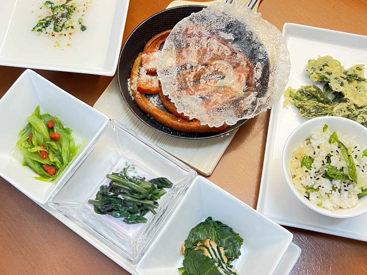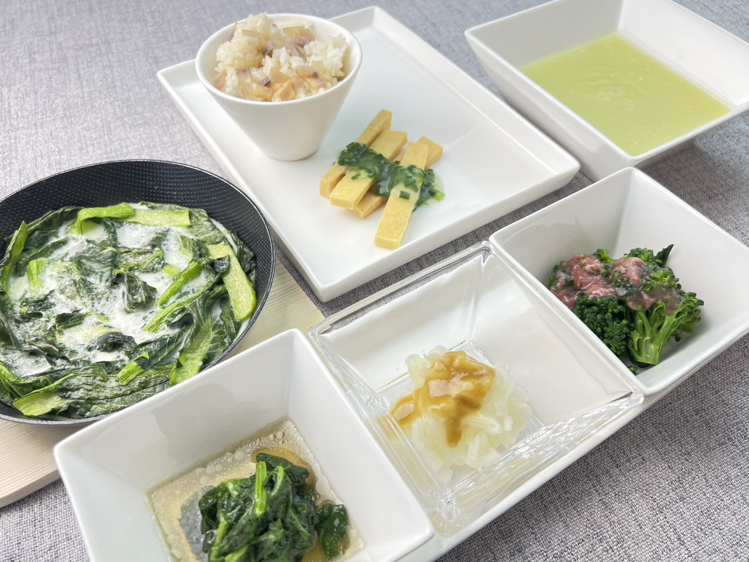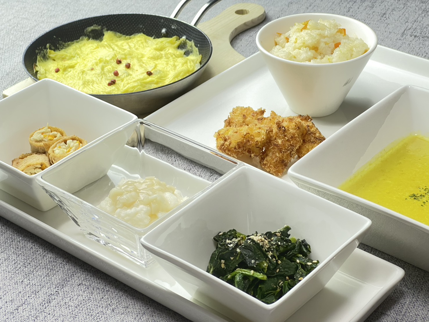 例えば、4月には旬のアスパラガスを使ったご飯、7月には熟れたトマトとオクラのゼリー寄せ、10月には秋かぶのポタージュ、12月には大根とりんごのグラタン。 旬野菜を使うことで、季節の恵みを包み、野菜のやさしい味を月替わりでご提供しています。